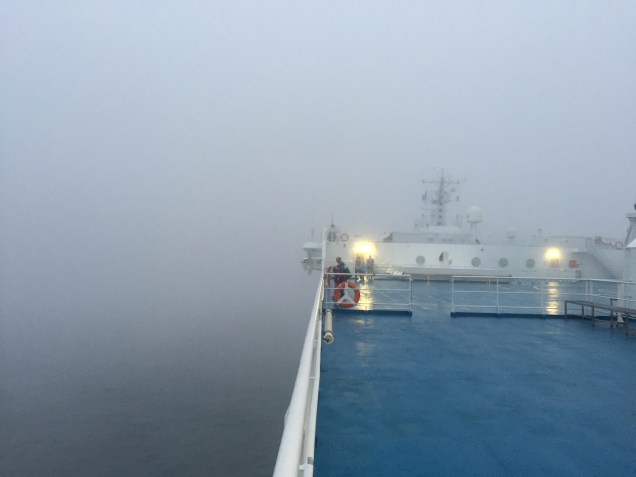 Die Nacht ist kurz, doch wir estimieren den Luxus der Kabine, die wir kurz vor der Abfahrt noch buchen konnten. Wie immer auf den Fähren ist der Faktor Genuss nicht für die ganze Reisegruppe gegeben. So verzieht sich die eine Hälfte auf’s Deck 10 an die frische Luft, während die andere das Frühstück einnimmt.
