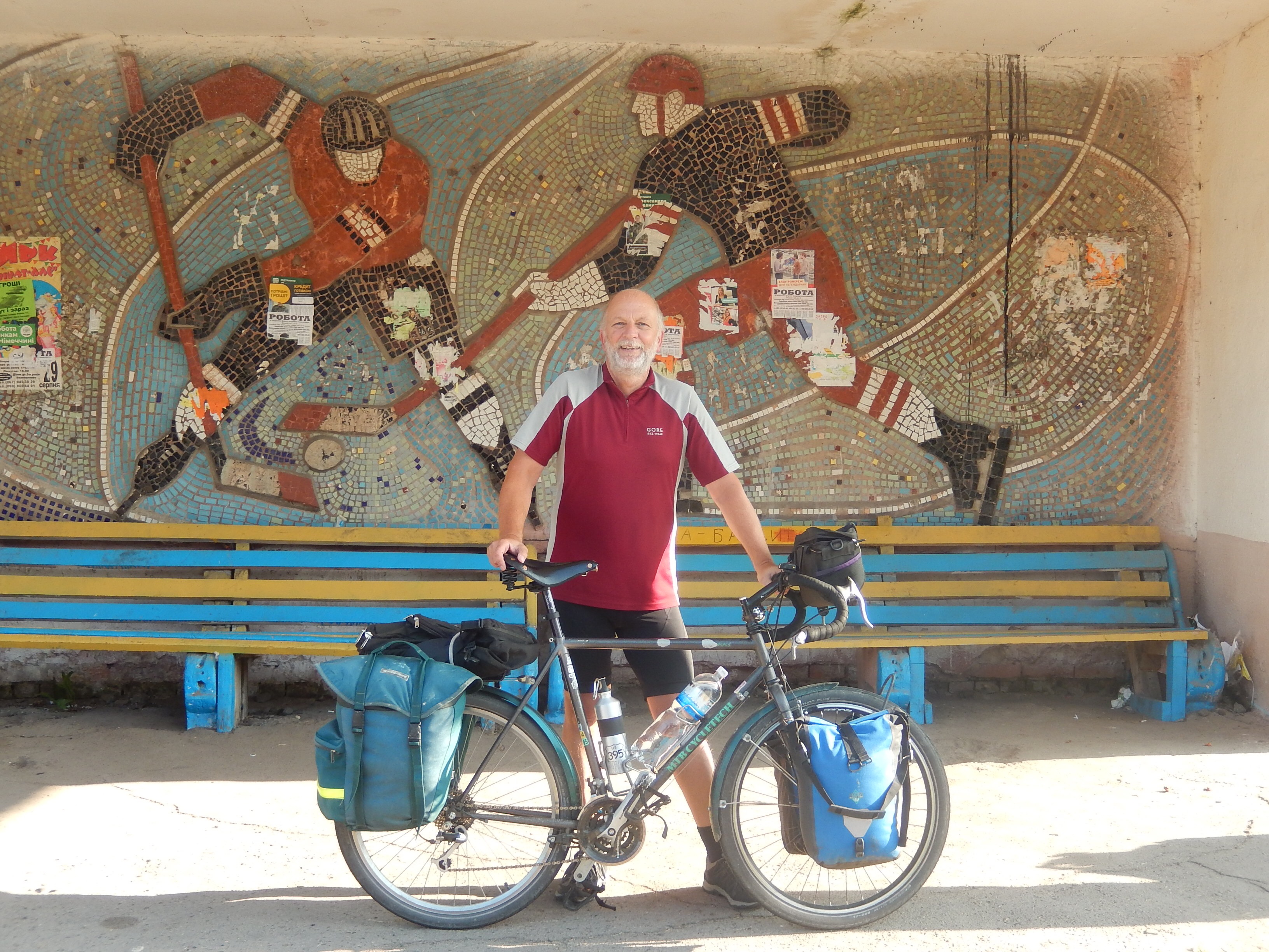 Das erste Dorf heisst Berlyn. Das Mosaik der Bushaltestelle zeigt zwei Hockeyspieler der Sbornaja am Werk – viele Bushaltestellen in der Ukraine sind mit aufwändigen Mosaiken verziert.