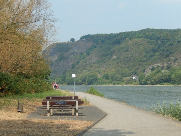 Erst in Remagen haben die Strassencafés geöffnet. Alle Radfahrer sitzen im Schatten vor grossen Gläsern, wir tun es ihnen gleich. Dann geht es weiter, wir freuen uns über die schön angelegte Route, die Sicht auf den Rhein und die Wälder des Gebirges. Etwas ungewohnt ist das Geräusch des welken Laubes unter unseren Rädern. Es tönt, als wären wir im Herbst unterwegs. Die Bäume haben eindeutig Hitzestress – wir auch.