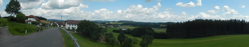 Oben angekommen geht’s weiter durch eine abwechslungsreiche Hochebene. Die Abfahrten an die Bäche und die Wiederanstiege erinnern in ihrer Anlage in der Falllinie ein wenig an England… und je näher wir der Tschechischen Grenze kommen, umso dünner besiedelt kommt uns die Gegend vor. Nach Überquerung des Grenzbachs ist dann allerdings kilometerweit “goa nix mehr” – außer einem nigelnagel-neu geteerten Radweg durch einen riesigen Auenwald (vermutlich die frühere Sperrzone entlang des Eisernen Vorhangs). Ab und zu kommt noch eine halb zerfallene Grenzwächterkaserne (gut erkennbares Einheitsmodell, bekannt von früheren Reisen). Unsere Radreisenden-Idylle wird dann doch noch durch ein ungutes Pöpperlen im Blätterdach gestört. Die Buchen sind so dicht, dass wir trocken bleiben. Das richtige Gewitter legt exakt dann los, als wir die Velos unter dem Vordach des heutigen Gasthauses parkiert haben. Eine absolute Punktlandung! Dann gießt es Eine Viertelstunde lang wie aus Badewannen.