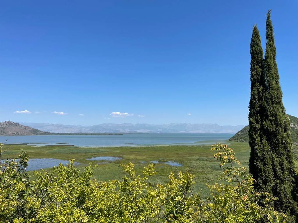 Nach einer ausgiebigen Pause folgt die lange Abfahrt nach Virpazar, dort haben wir schon mal übernachtet. Der Skutarisee ist eindrucksvoll, umgeben von Bergen, voller Vögel und Fische. Wir trinken einen Eiskaffee, lauschen der südslawischen Schlagermusik und sind definitiv angekommen. So geht Ferien. Dann gehts noch ein paar Kilometer auf der Hauptstrasse, vorbei am ersten, ganz frischen!, Waldbrand, über den Damm bis zu unserer Unterkunft, wo wir auf Deutsch empfangen werden.