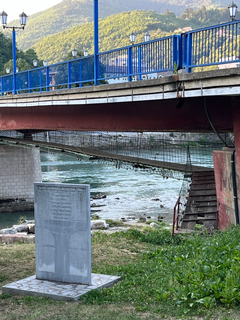 Nach Foča wählen wir die kleinere Strasse auf der rechten Seite der Drina. Eine gute Wahl: sie ist schmal, meist gut geteert und hat keinen Verkehr. Rund 10 Kilometer vor Goražde müssen wir dann doch auf die Hauptstrasse. Gerne wären wir bis Višegrad gefahren heute. Aufgrund der Hitze bleiben wir aber in Goražde, der einzigen Stadt der Bosnischen Föderation an der Drina. Alle anderen gehören zur Republika Srpska. Goražde war eine der UN-Schutzzonen im Bosnienkrieg mit zeitweise bis zu 70‘000 Einwohner:innen. Auch hier ist von jener Zeit nicht mehr viel zu sehen. Eine Ausnahme macht die Brücke unter der Brücke, welche die Menschen hier bauten, um den Snipern zu entgehen. Und alles ist etwas ärmer bzw. scheint etwas perspektivenloser als anderswo.