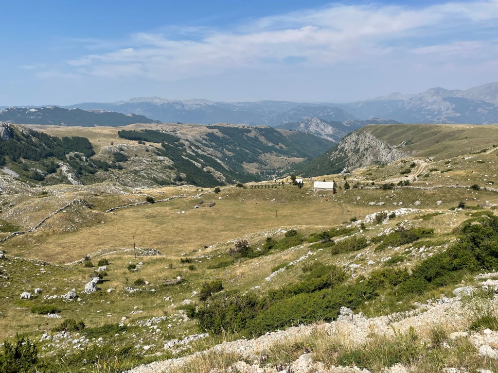Da wir eine weitere Bergetappe vor uns haben, fahren wir ohne Frühstück los, vorbei an Zabljak, hinaus in die Wiesen- und Steppenlandschaft. Ein Hund in der Grösse eines Kalbes möchte mit kommen. Dann gibt er auf, wir hatten grad ein stattliches Tempo. Das ändert sich, als wir von der Hauptstrasse rechts abzweigen auf eine weitere ‚Panoramic Road‘, übersetzt ‚die Krone von Crna Gora‘. Die Strasse steigt an, hinauf in ein Tal, zuerst noch im Buchenwald, dann bald im Wiesland, vorbei am höchsten Gipfel Montenegros (Bobotov Kuk). Ein Bänkli lädt zu einer Pause, wir essen Früchte. Auf der ersten Passhöhe essen wir Müesli und beobachten die Bergsteiger, wie sie sich für die Tour rüsten. Kühe weiden auf und neben der Strasse und der Parkwächter kontrolliert, ob alle ihren Eintritt in den Nationalpark bezahlt haben.