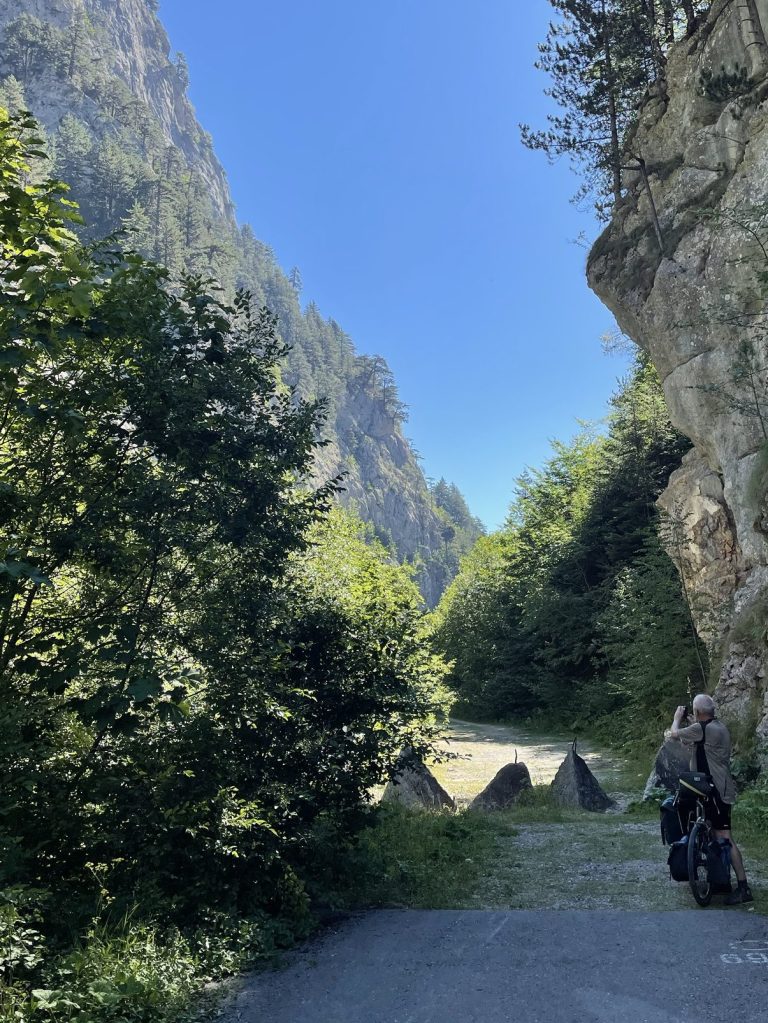 Der Wecker läutet um 5 Uhr, Müesli Frühstück gibt’s im Zimmer. Dann rollen wir durch das morgendlich kühle Pejë. Gestern Abend haben wir am Stadtrand gegessen und waren leicht geschockt über die grossen Rudel Strassenhunde. Mögen sie eine erfolgreiche Nacht gehabt haben. Das erste Rudel kläfft uns noch weit vor den letzten Häusern in Todesangst. Doch es hat Passanten, und die Hunde lassen von uns ab. Einem zweiten Angriff entkommen wir ebenfalls ohne Verletzung. Dann geht es bergauf, rein in die Schlucht. Der Wind weht stark und kühl. Und die Strasse steigt. Vorbei an Felsen, durch Tunnel und erstaunlich viel Verkehr. Wo fahren die alle hin in dieser abgelegenen Gegend? Wir sind fasziniert von der Natur und essen nach 8 Kilometern etwas. Der Aufstieg ist noch lange. Der Weg verzweigt sich und es gibt eine Abzweigung zum Skigebiet. Ein einsamer Velofahrer sitzt am Strassenrand. Er macht an einem Radrennen mit und weiss scheinbar nicht, wo er ist. Von der nahen Landesgrenze weiss er jedenfalls nichts. Macht nichts, wir wissen ja, wo wir hin wollen. Nach einer kleinen Siedlung treffen wir auf die erste Wandrerin. Dann biegen wir ab auf eine Naturstrasse. Nach rund zwei weiteren steilen Kilometern kommen die erwarteten Marken, wir haben die Grenze zu Montenegro erreicht.