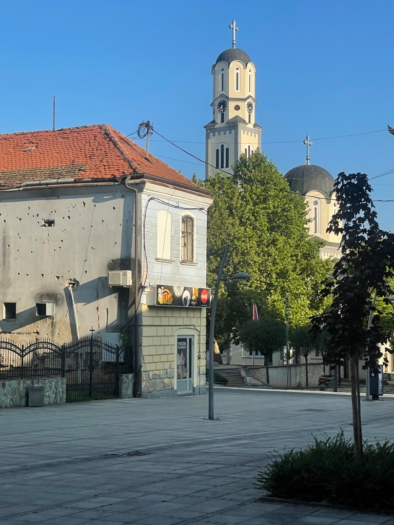 Am nächsten Tag fahren wir früh los und ziehen uns warm an. Doch der Hügel vor Derventa treibt den Schweiss. In Derventa trinken wir Kaffee, finden einen Bankomat, die ersten zwei auf der digitalen Karte sind Phantome. Im Laden füllen wir die Vorräte auf. Dann geht es rund 10 Kilometer durch einen Hügelzug an die Sava. Leicht geschockt nehmen wir die ganz frischen Absperrbänder mit der Aufschrift „MINE“ zur Kenntnis. Wir haben in den vergangenen Tagen immer wieder Warnsignale gesehen, doch hier ist eine riesige Fläche gekennzeichnet und zwar ganz frisch. Die Strasse entlang der Sava ist genial und hat wenig Verkehr. Das Fahren ist fast so entspannt wie auf einem Radweg. Es überholen uns zwei sportliche Radfahrer ohne Gepäck. Das haben wir lange nicht gesehen.