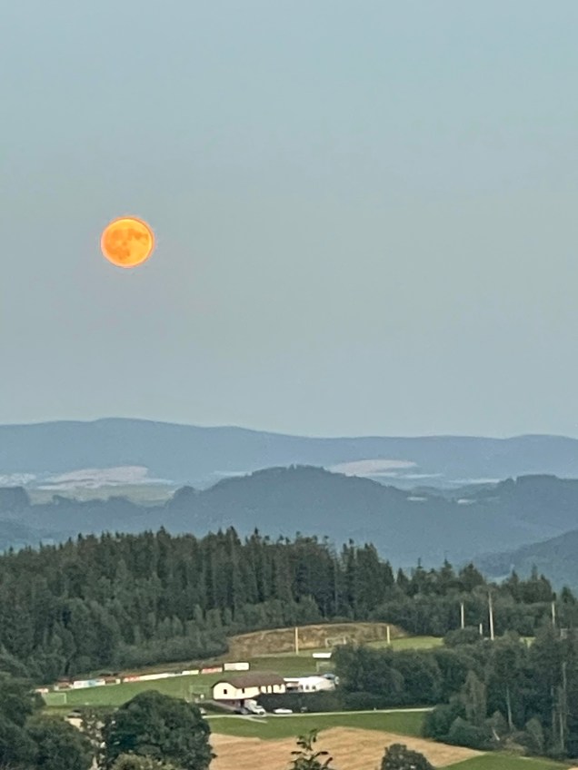 Wir befinden uns jetzt auf der Thermenlinie. Das ist eine tektonische Verwerfung, auf der sich unzählige Thermalquellen befinden. Weiter südlich waren wir vor einigen Jahren schon in Bad Radkresburg. Auch weiter östlich waren wir schon in Thermen im Burgenland und in Ungarn. Jetzt folgen wir der Linie auf dem Thermenradweg gegen Norden. Nach Hartberg müssen wir rüber ins Tal der Lafnitz und dann hoch nach Friedberg. Dort stärken wir uns bei einer kalten Limo und füllen unsere Wasserflaschen. Der Radweg führt zuerst runter nach Pinggau um nachher in einer höllisch steilen Rampe Richtung Wexel zu steigen. Wir sind frustriert, dieser Höhenverlust war irgendwie unnötig. Schliesslich entscheiden wir uns, auf die grosse Strasse zu wechseln. Das ewige auf und ab auf dem Radweg ist zermürbend wenn man weiss, dass man auf 967 Meter Seehöhe klettern sollte. In Mönichkirchen finden wir Platz und Verpflegung in einem wunderbaren Gasthof mit Aussicht in die Ebene. Wie weit man bei klarer Sicht wohl sehen könnte.