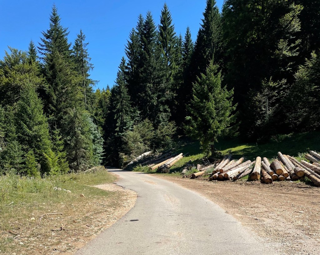 Die Gegend lebt von der Holzwirtschaft. Die Strasse wurde offensichtlich dafür angelegt. Sie führt Kilometerweit flach (!) durch den Wald, bevor sie dann wieder Hügel auf und Hügel runter führt. Es kommt ein Haus, vermutlich ein Ferienhaus, dann ein abgelegener Hof. Irgendwann kommt eine Abzweigung. Jetzt wird es schwierig. Es sind noch immer 10 Kilometer bis zum Ziel und die geplante Route ist noch weit weg. Also weiter. In einer Lichtung stärken wir uns mit Keksen. Irgendwann erreichen wir eine Anhöhe. Von da sieht man in die Hochebene hinaus und kann an den Wohnhochhäusern im Baustil der Jugosphäre endlich erkennen, wo das heutige Tagesziel ist.