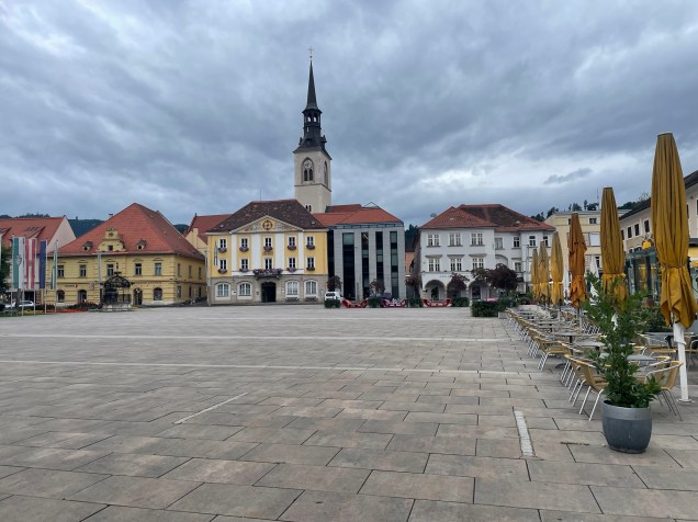 Nach Judenburg öffnet sich das Tal und der Radweg hat hier verschiedene Varianten. Wir fahren auf der Südvariante duch die Wälder und über die Felder. Bis die Siedlung bei Knittelfeld den gesamten Talboden beschlagnahmt. Wir suchen einen Laden, wir sollten unsere Vorräte vervollständigen. Deshalb verlieren wir den Radweg und haben danach Mühe, ihn wieder zu finden. Auf diesem Abschnitt folgt er offensichtich den Hauptstrassen. Er ist aber nicht mehr durchgängig als Murradweg gekennzeichnet, deshalb suchen wir ständig den Weg. Oder wir waren tatsächlich nicht auf der richtigen Route? Dann wird das Tal wieder enger und wir sind wieder auf dem Murradweg unterwegs. Leoben überrascht uns als wunderbare alte Stadt mit grossem Marktplatz. Wir machen Pause und lesen über den Ort. Leider verschlechtert sich das Wetter wieder und es scheint nochmals Regen zu geben. Wir beeilen uns, nach Bruck an der Mur zu kommen. Dort wollen wir heute Abend bleiben. Kaum sind wir dort und die Räder in der Garage des Hotels verstaut, beginnt der Regen. Für einmal haben wir Glück!
