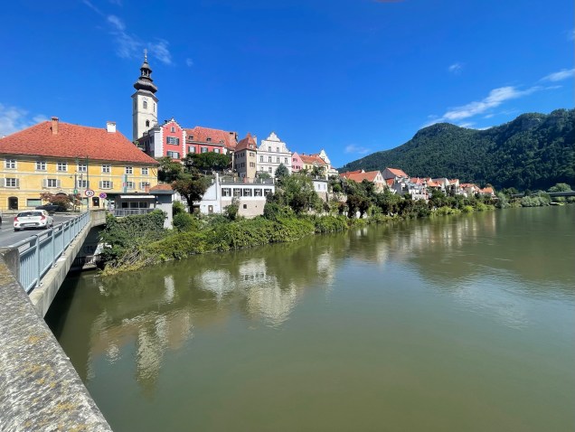 Bad Fischau verlassen wir nach dem Frühstück an einem Sonntag, es ist bereits heiss. Mit dem Fahrtwind fühlt es sich recht angenehm an. Wir fahren gegen Norden und müssen einige Entwässerungsrinnen queren. Das ergibt bereits die ersten Gegenanstiege. Auf einem Steg treffen wir eine ältere einheimische Radfahrerin. Sie erkundigt sich nach unserem Ziel. Einige Kilometer später überholt sie uns wieder, als wir am Strassenrand die Route prüfen. Gerne würde sie uns den Weg erklären, doch irgendwie ist es kompliziert. Scheinbar fährt sie ohne Navigationsapps und kann sich schlecht vorstellen, wie man den Weg finden kann. Wir müssen noch eine Wasserflasche füllen, bevor wir Richtung Berndorf abzweigen und ins Tal der Triesting hochsteigen. Auch hier gibt es einen gut beschilderten, schön angelegten Radweg. Wunderbar! Allerdings kommen wir an keiner Einkaufsmöglichkeit vorbei. Die Läden sind geschlossen und an Tankstellenshops kommen wir nicht vorbei. In Berndorf ist alles zu. Wir setzen uns auf eine Bank im Schatten eines Spielplatzes und essen Guetzli aus dem Notvorrat.